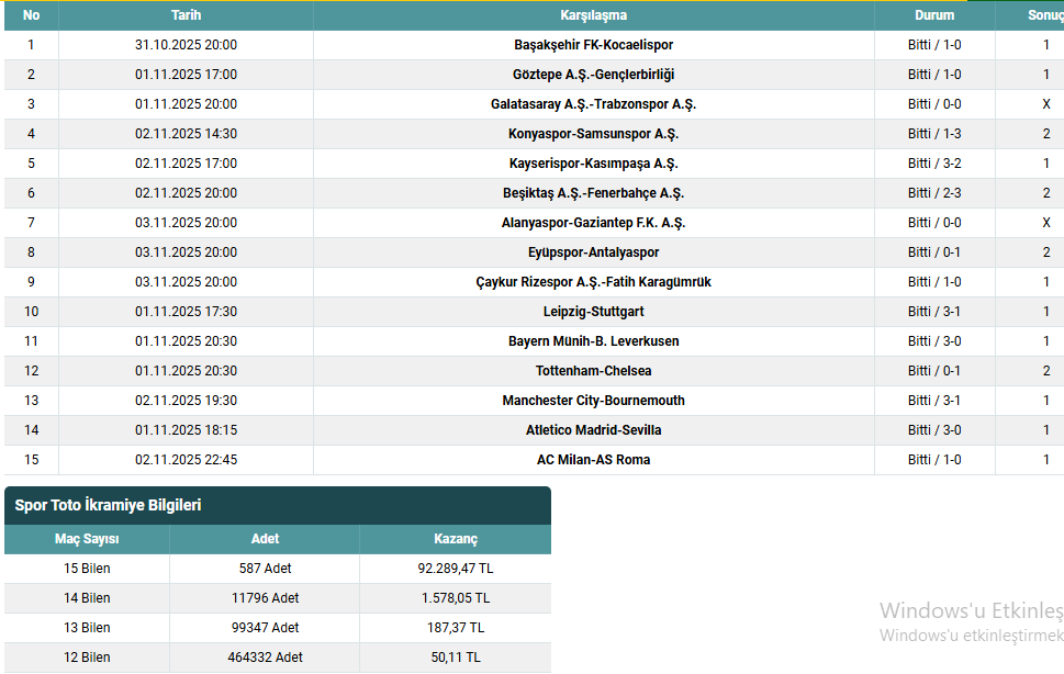 13.hafta 2 sıfır 1ters. bu hafta kalan maçlardan 1 sıfır gelise ikramiye en iyi ihtimalle bu şekil olur..40-70 bandında